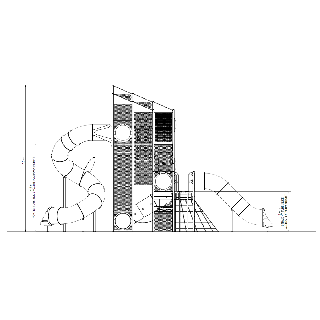 This giant tower and vortex slide sitting at over 8m tall will create a stunning visual impact, sure to excite the community and inspire the imagination of young and old. From the climbing ropes, side elevator and banister rails, there is a huge amount of play value packed into every level, down to the hammocks and crawling tunnels there is loads of fun to be had by users of all abilities.