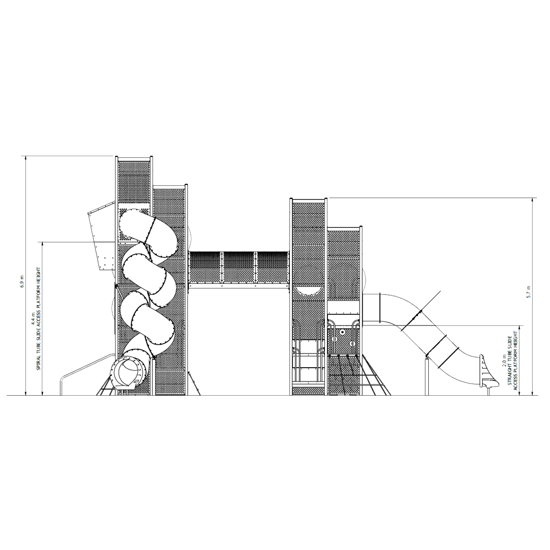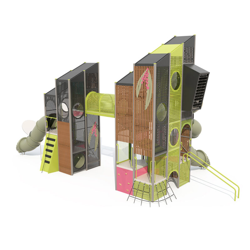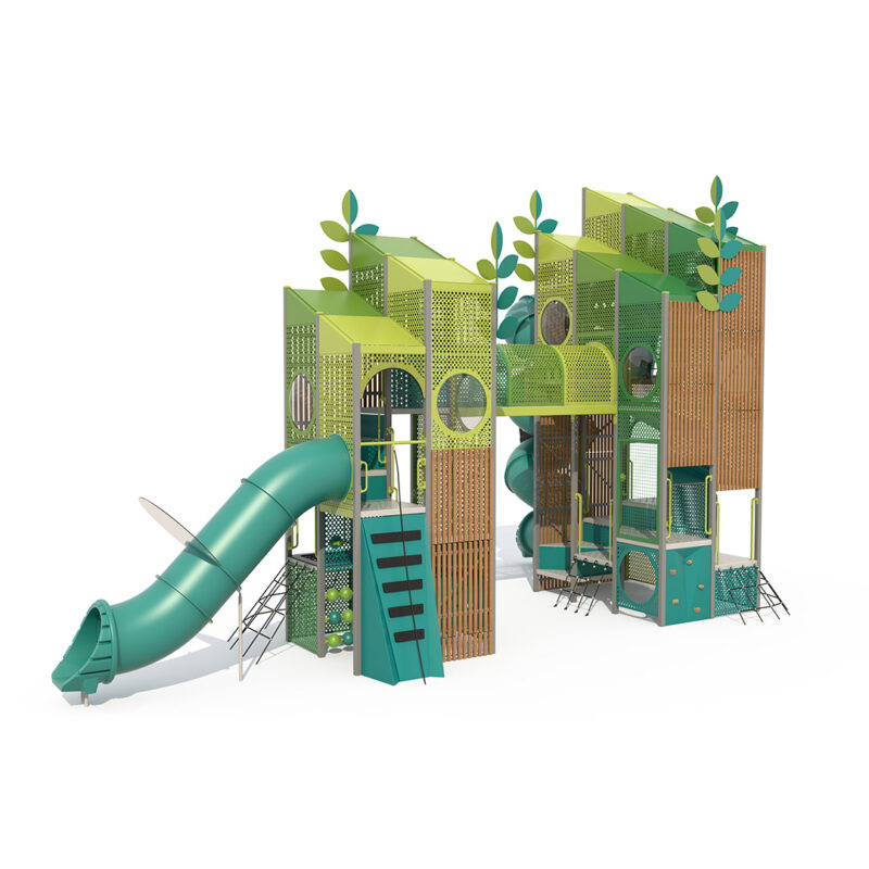 Connected by a 3m Highline Rope Bridge, this mega play tower has multiple routes and climbing pathways kids can explore that will challenge and thrill. Low level sensory elements are also hidden throughout for kids to discover, such as talk tubes, bead panels and secret passages.
