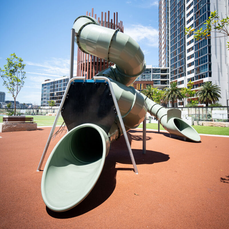 Working closely with LandFX, we proposed and co-designed a twin Lofts unit featuring single and double-story towers with exciting tunnel slides. Once the design was finalised, we managed manufacturing and installation, completing the project with vibrant rubber softfall that ties the space together beautifully. Nestled against the backdrop of Parramatta’s tall buildings, this playground has become a true showstopper, embraced by the local community.